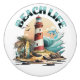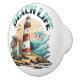 Handgriff des Beach House. Illustration einer Strandszene mit Leuchtturm, Surfbrettern, Palmen und Delphin.