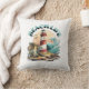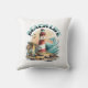 Strandgedecktes Kissen. Illustration einer Strandszene mit Leuchtturm, Surfbrettern, Palmen und Delphin.