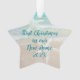 Erste Weihnachts-Zuhause Seesterne-Ornament. Stern geformter Acrylknebel mit Text auf beiden Seiten. Geben Sie den Veranstaltungskommentar mit Datum auf der einen Seite und Namen und Anschrift auf der anderen Seite an. Aquamarine Meer und Strand Sand ist der Hintergrund für das Meer grüne Text. Zwei Seesterne zieren beide Seiten. Ändern Sie den Wortlaut und die Verwendung für jeden Anlass mit Namen und Datum. Das Design funktioniert auch für die anderen Zierformen, aber die Platzierung des Designs kann sich verändern.