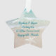 Premier ornement d'étoiles de mer de Noël. L'acrylique en forme d'étoile garde le texte des deux côtés. Inclure le libellé de l'événement avec la date d'un côté et les noms et l'adresse de l'autre. Eau de mer et sable de plage Aquamarine est l'arrière - plan du texte vert de mer. Deux étoiles de mer décorent également chaque côté. Modifier le libellé et l'utiliser pour toute occasion avec les noms et la date. La conception fonctionne également pour les autres formes ornementales, mais le placement de conception peut changer.