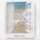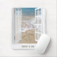 Offenes Fenster mit glänzenden Vorhängen mit Blick auf den Strand und die Herzen mit den Namen der Paare. Die Namen der Paare können bearbeitet werden.