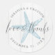Runde Hochzeit am Strand Gunst Label Aufkleber für eine rustikale Hochzeit am Strand mit einer Vintagen Seesterne-Illustration und klassischen klassischen Serif-Schriftart und elegante Kalligraphie Handschrift "Liebe und Dank" mit Namen und Hochzeitstag. Klicken Sie auf KUNDENFÖRDERN, um die Farben oder Schriftart zu ändern, die mit Ihrem Event koordiniert werden sollen.