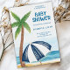 Beach-themed baby shower invitation featuring a palm tree and a striped umbrella on sand with blue ocean waves. Text details event info in blue font.