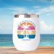 Cute custom beach wedding wine tumblers for a seaside wedding bridal party at the coast. Cool personalized favors for your bridesmaids and maid of honor featuring tropical palm tree and pretty pink and blue for a coastal event this summer.