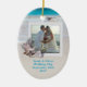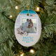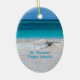 Halten Sie Hochzeitsschmuck mit einem Strandthema. Fügen Sie diesem ovalen, Keramik-Ornament ein Bild hinzu und passen Sie es mit Text auf beiden Seiten an. Tropische Muscheln schmücken den Rahmen und das Hintergrundbild ist das Meer Wasser und Strand Sand. Platzieren Sie Namen, Hochzeitsdatum auf der Vorderseite und Zielort auf der Rückseite.