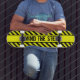 Skateboard in cooler und lustiger Warnzeichentechnik. Der Text "MIND THE STEP" ist anpassbar.