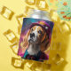 Ein spielerischer Beagle in einem pulsierenden, skurrilen Kostüm gekleidet vor einem glänzenden, magischen Hintergrund. Dieses bezaubernde Design ist perfekt für Tierfreunde.