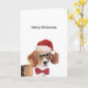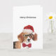 Weihnachtskarte aus dem Beagle. Beagle mit einer Bogen-Krawatte, Glas und Weihnachtsmannmütze.