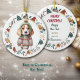Dieses niedliche Holiday-Ornament besticht durch ein Aquarellbild eines bezaubernden Beagle, der in seinem Winterpulli und Hut gekleidet ist. Das Bild ist in einem farbenfrohen Kreiskranz gerahmt, der aus verschiedenen Holiday-Bildern besteht, darunter ein Schneemann, Glocken, Bonbons, Strumpf, Heilige und vieles mehr! Die Rückseite des Ornaments hat das gleiche Kranzbild mit Ihrem benutzerdefinierten Text in Grün, Gold und Rot.