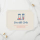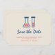 Save the Date Karte mit einem niedlichen zeichn eines Reagenzglases und eines Bechers. Ideal für Wissenschaftsliebhaber.