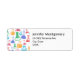Adressetiketten mit einem lustigen und farbenfrohen Muster. Wissenschaftler schauen mit Beakern und Flaschen verschiedener Formen und Größen in hellen, fröhlichen Farben.