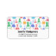 Adressetiketten mit einem lustigen und farbenfrohen Muster. Wissenschaftler schauen mit Beakern und Flaschen verschiedener Formen und Größen in hellen, fröhlichen Farben.