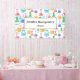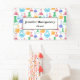 Business Banner mit einem lustigen und farbenfrohen Muster. Wissenschaftler schauen mit Beakern und Flaschen verschiedener Formen und Größen in hellen, fröhlichen Farben.