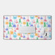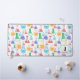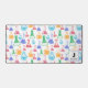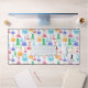 Schreibtischmatte mit einem lustigen und farbenfrohen Muster. Wissenschaftler schauen mit Beakern und Flaschen verschiedener Formen und Größen in hellen, fröhlichen Farben.