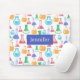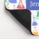 Mousepad mit einem lustigen und farbenfrohen Muster. Wissenschaftler schauen mit Beakern und Flaschen verschiedener Formen und Größen in hellen, fröhlichen Farben.