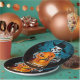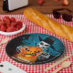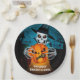 Ein spukiges Skelett in einem Hopfenhut hält einen beängstigenden Jack o' Laterne an einem dunklen Halloween-Abend auf diesen Halloween-Party Papier-Tellern. PASSENDE Artikel in unserem Geschäft.