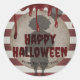 Diese seltsamen Halloween-Aufkleber-Etiketten zeichnen sich durch ein gruseliges Karnevalthema aus. Ein Schatten eines beängstigenden Clowns, der einen Ballon hält, wird in der Mitte aufgedruckt. Im Hintergrund ist ein Vintages Karnevalposter aus Pergamentpapier mit kreisförmigen Pergamenten über einem rot-weiß gestreiften Muster zu sehen. Blut tropft über den oberen Teil. Der Gruß "Happy Halloween" wird oben in einem blutroten, finsteren Schriftart bedruckt. Über den Clowns wird ein BeispielFamilienname gedruckt, den Sie personalisieren können, um Ihren eigenen individuelle Name oder Text einzubinden.