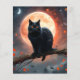 Auf einem Baumzweig vor Vollmond mit fliegenden Fledermäusen im Hintergrund abgebildet ist eine schwarze Katze mit orangefarbenen Augen.