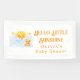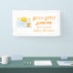 A cheerful watercolor banner design featuring a smiling sun rising above soft blue clouds, surrounded by glowing stars and a cuddly teddy bear. The warm yellow and sky-blue palette creates a joyful and welcoming atmosphere inspired by the popular sunshine theme. Personalized with a name, this charming layout is perfect for decorating baby celebrations, photo backdrops, and creating a memorable focal point for special moments.