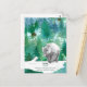 Eine ermutigende Postkarte mit einem Bär, der auf einem Baumstamm klettert, in einem immergrünen Wald mit zwei Bären höher in den Bergen illustriert mit Bleistift und Aquarell. Einige Worte der Bärensymbolik liegen unter den gemeinsamen und wissenschaftlichen Namen.