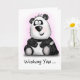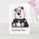 Très mignonne carte d'anniversaire de panda de dessin animé. Panda est dessiné à la main et converti en format numérique. Il y a des reflets roses doux derrière le panda.