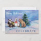Ein Panda-Bär, ein Eisbär und ein brauner Bär sitzen auf einem schneebedeckten Feld mit einem immergrünen Baum im Hintergrund und halten Weihnachtsgeschenke. Die Urlaubseinladungskarte lautet "Beary Holidays" und "CELEBRATE". Auf der Rückseite der Einladungskarte befinden sich die Angaben zum offenen Party. Passen Sie diese Karte mit allen personalisierten Optionen an!