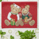 Berry Frory Weihnachts Teddy Bären. Junge und Mädchen sind in ihren Urlaubskleidern gekleidet. Der Junge trägt eine Weihnachtsmannmütze. Die Girl-Teddy hat einen Lebkuchen. Niedliches saisonales Design.