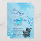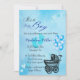 Annoncez l'arrivée de votre bébé garçon et accueillez votre baby shower avec mon beau modèle d'invitation à thème bleu avec une mignonne poussette à ballons bleus, représentant également des petits pieds de bébé potelés.
