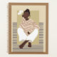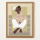 Une femme est assise dans un pull rayé et un pantalon blanc avec marguerites.
