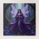 Eine wunderschöne Fee mit fließendem lila Kleid und eine Halskette aus Amatysten mit Violetten in ihren langen lila Haaren und lila Libellen, die eine Violette tragen, steht in einem zauberhaften Wald, umgeben von bunten Pilzen, Blume und mossy, von Weinreben bewachsenen Bäumen.