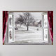 View through open window onto a beautiful frozen lake winter snow in rural England. Red curtains hang in front of the modern double glazed window
