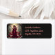 Eine wunderschöne Fee mit fließendem rotem Kleid und Schmuck aus Rupien mit Wasserlilien in ihren langen roten Haaren und hellroten Libellenflügeln mit einer Seerosenlilie steht in einem flachen Teich inmitten eines magischen Waldes, umgeben von Seelilien, Lilienpads, rosa Blume und von Rebstöcken.