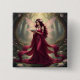 Eine wunderschöne Fee mit fließendem rotem Kleid und Schmuck aus Rupien mit Wasserlilien in ihren langen roten Haaren und hellroten Libellenflügeln mit einer Seerosenlilie steht in einem flachen Teich inmitten eines magischen Waldes, umgeben von Seelilien, Lilienpads, rosa Blume und von Rebstöcken.