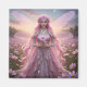 Eine wunderschöne Fee mit einem fließenden rosa Kleid und eine Halskette aus Opalen mit Opalen und Kosmos-Blume in ihren langen rosa Haaren und hellrosa Drachenfliegenflügeln mit einer rosa Kosmos-Blume steht in einem magischen Feld von Kosmos-Blume, umgeben von Blasen an einem Nachthimmel.