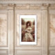 This poster is of a beautiful Rococo woman standing in a field with trees in the background and wild flowers growing amongst the tall grasses.