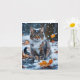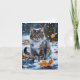 Schöne graue Tischkatze, die zwischen den farbenfrohen Herbstlauben auf dieser weißen Grußkarte sitzt.