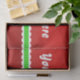 Weihnachtspapier mit rotem Hintergrund und grünem Band.