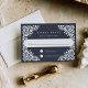 Diese elegante RSVP-Karte, die sich mit unserer Hochzeitskollektion Beaux Arts abstimmt, zeichnet sich durch einen weißen Rahmen im Pappel-Picado-Stil aus, der Ihren Wunschtermin und Ihre individuelle Akzeptanz und Abwärtsformulierung abbildet. Ein reichhaltiger, dunkelblauer Hintergrund verleiht dem Ganzen eine beeindruckende Eleganz.