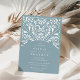 Elegante Vintage Hochzeit Einladungen in staubblau mit einer Touch von aqua verzierte Details, die das Aussehen von geschnittenem Papier in einem papel picado Stil.