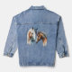 Veste Denim avec un beau dessin aquarelle. Avec une paire de chevaux, brun et blanc. Tête et cou visibles avec de la peinture goutte le long de la base de leur cou. L'ambiance du sud-ouest.