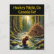 Ein Biber steht in einem überwältigenden Fluss und hält einen Ast, als wäre er eine Gitarre, vor einer Biberhütte in einem Wald.
