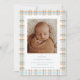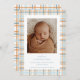 Annoncez l'arrivée de votre petit garçon avec ce charmant faire-part de naissance bébé, avec un design plaid bleu et orange qui est parfait pour l'automne! Les couleurs douillettes et saisonnières confèrent à cette faire-part une atmosphère chaleureuse et accueillante, ce qui en fait une belle façon de partager vos nouvelles joyeuses avec votre famille et vos amis. Entièrement personnalisable avec les détails de votre bébé et un message spécial, cette faire-part est une façon élégante et chaleureuse de présenter votre plus récent ajout au monde. Parfait pour une faire-part de naissance à thème chute !