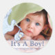 Baby Boy Blue Stork with a Baby Boy Bundle All Wrapped up and Ready for Delivery with Baby's Photo Front and Center for the Whole World to See! Bonjour Monde de la plus douce petite auto-collante photo de bébé garçon jamais.
