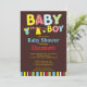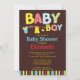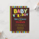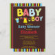 Commencez votre baby shower de bébé avec notre invitation à l’baby shower en tissu de bébé mignon et coloré. Notre invitation moderne pour bébé garçon comporte un joli linge de linge de bébé avec un babyfoot, bib & chaussettes avec de gros lettrage brillant et audacieux sur un arrière - plan marron avec une bordure et un dos rayés bleus jaunes et verts. ©Dessins Blackleaf