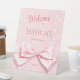 Ces adorables panneaux de bienvenue pour baby shower à pois roses présentent un joli ruban rose et une combinaison de polices de caractères calligraphiées, serif et sans serif. Pour personnaliser, cliquez simplement sur 'personnaliser ce design' et entrez vos informations. Zazzle fera le reste. Cette charmante invitation fait partie de la suite d'invitations pour baby shower Polka Dots, Ribbons, et Bow,