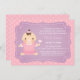 Une jolie invitation baby shower avec une petite fille dans un morceau de tutu doux et adorable. Elle tient un jouet de hochet d'une main et a une sucette dans la bouche. motif pois pour arrière - plan. Les teintes rose et violet en font une invitation douce et girly pour les petites filles. Personnalisez facilement avec les détails de la fête.
