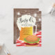 Invitation unique pour un baby shower bébé-q avec une tasse de bière posée sur une nappe à damiers rouge et un hamburger posé sur un arrière - plan en bois.