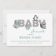 Belle invitation baby shower avec palette de couleurs turquoise et grise et bébé animaux reposant sur un script personnalisé "bébé". Toutes les informations sont dans la police sans serif prête pour une personnalisation facile.