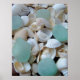Ein helles, grünes Meeresglas, umgeben von einer Sammlung wunderschöner weißer Muscheln.
