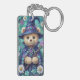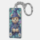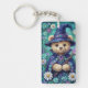 This whimsical keychain features a small bear, tender as a bedtime spell, sits at the heart of a meadow made of midnight and bloom. Round-eyed and gentle, it wears a deep blue wizard’s hat and cloak, both scattered with stars and jeweled with violet light, as if the sky itself had been sewn into fabric. A crystal pendant rests at its chest, glowing softly like a captured moonbeam. Around it, flowers gather in a bright, breathing circle—white petals, purple petals, yellow hearts—each blossom painted with the hush of spring rain and the joy of morning. The bear’s fur is warm honey and cream, soft enough to feel with the eyes alone, a quiet lantern in the garden’s cool glow. UùùúIn one tiny paw, a crystal wand catches the light, a little shard of magic held with the seriousness of a dream. The whole scene feels enchanted and intimate, as though the night has leaned close to listen, and the flowers have opened only to witness the gentle power of this plush little guardian.